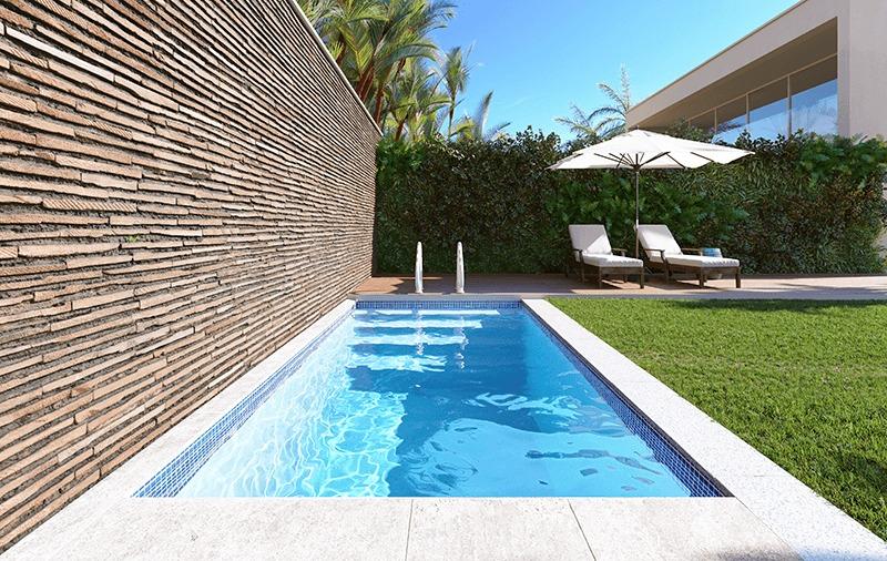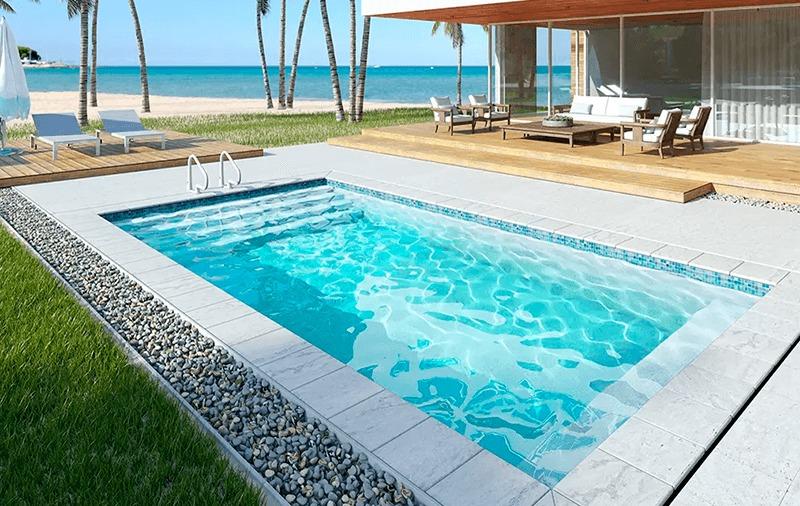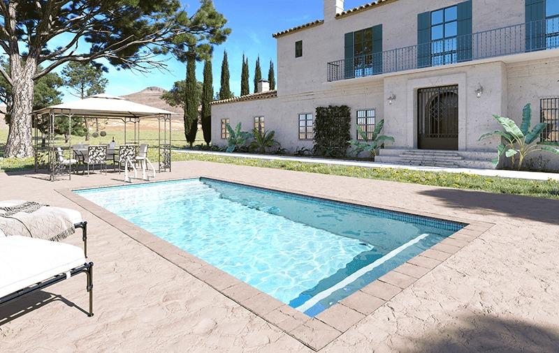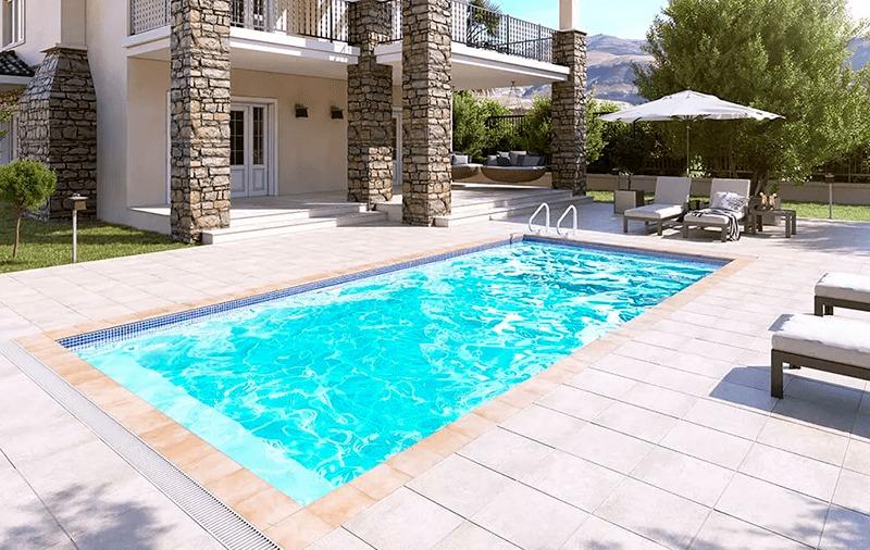 Aqua Menam G has received a special touch with the mosaic-covered edges of the inner walls. This pool model features a traditional design, with a bench and stairs on opposite sides, making excellent use of the available space."